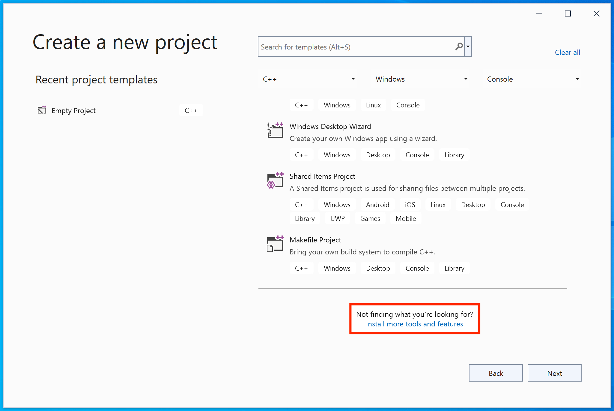 Note: If you find that you can't create a C++ project, you may not have installed the compiler during the installation process. From the “Create a new project” dialog, scroll all the way down the list of project types and click on the link that says “Install more tools and features”. Select the item labeled “Desktop development with C++” (see Installation Notes), then click the “Modify” button. You should then be good to go!