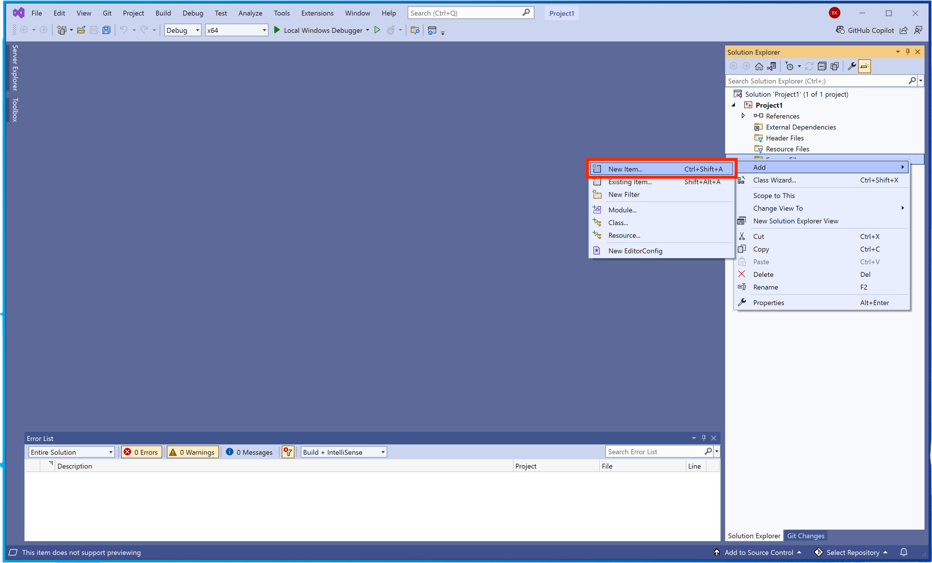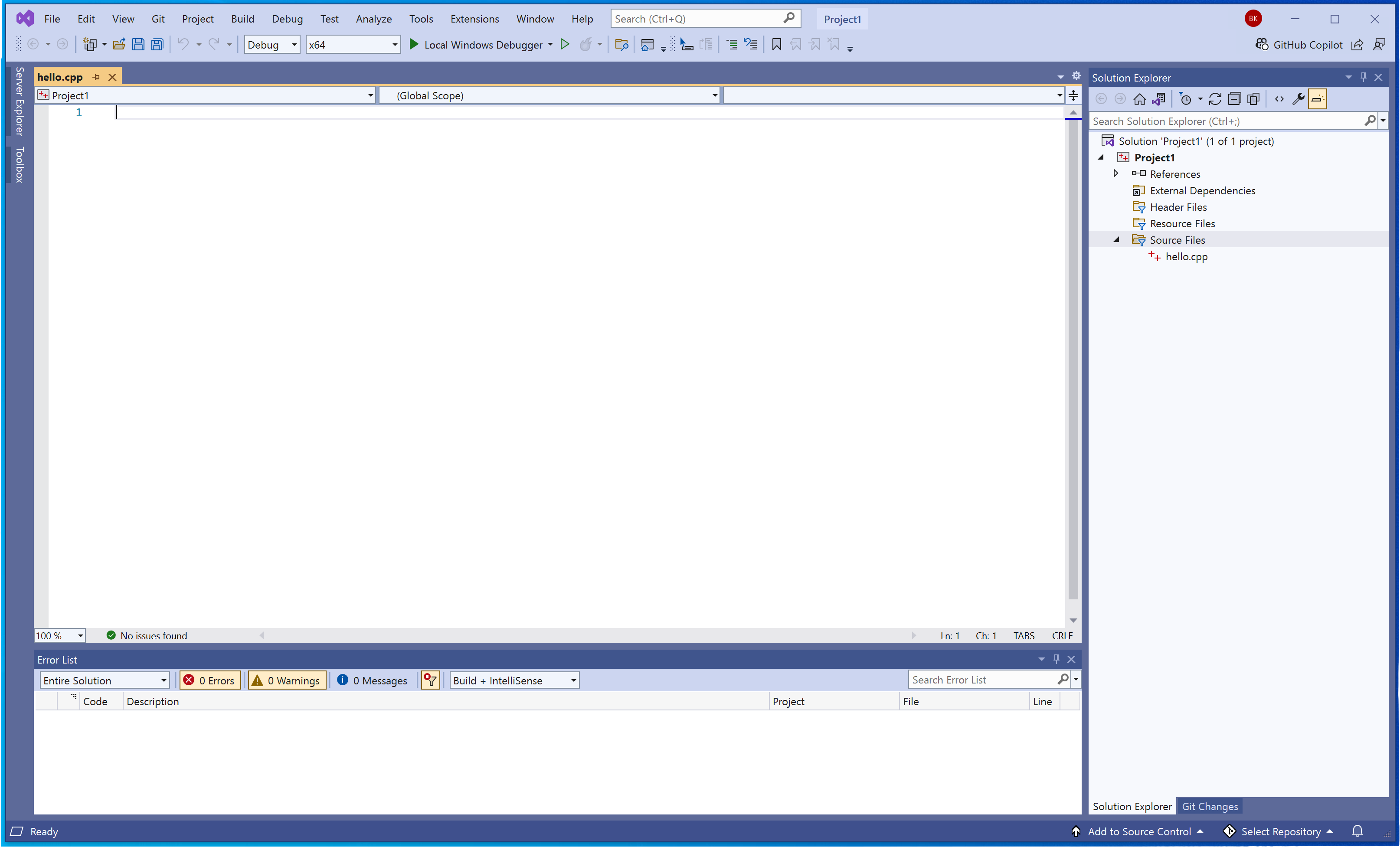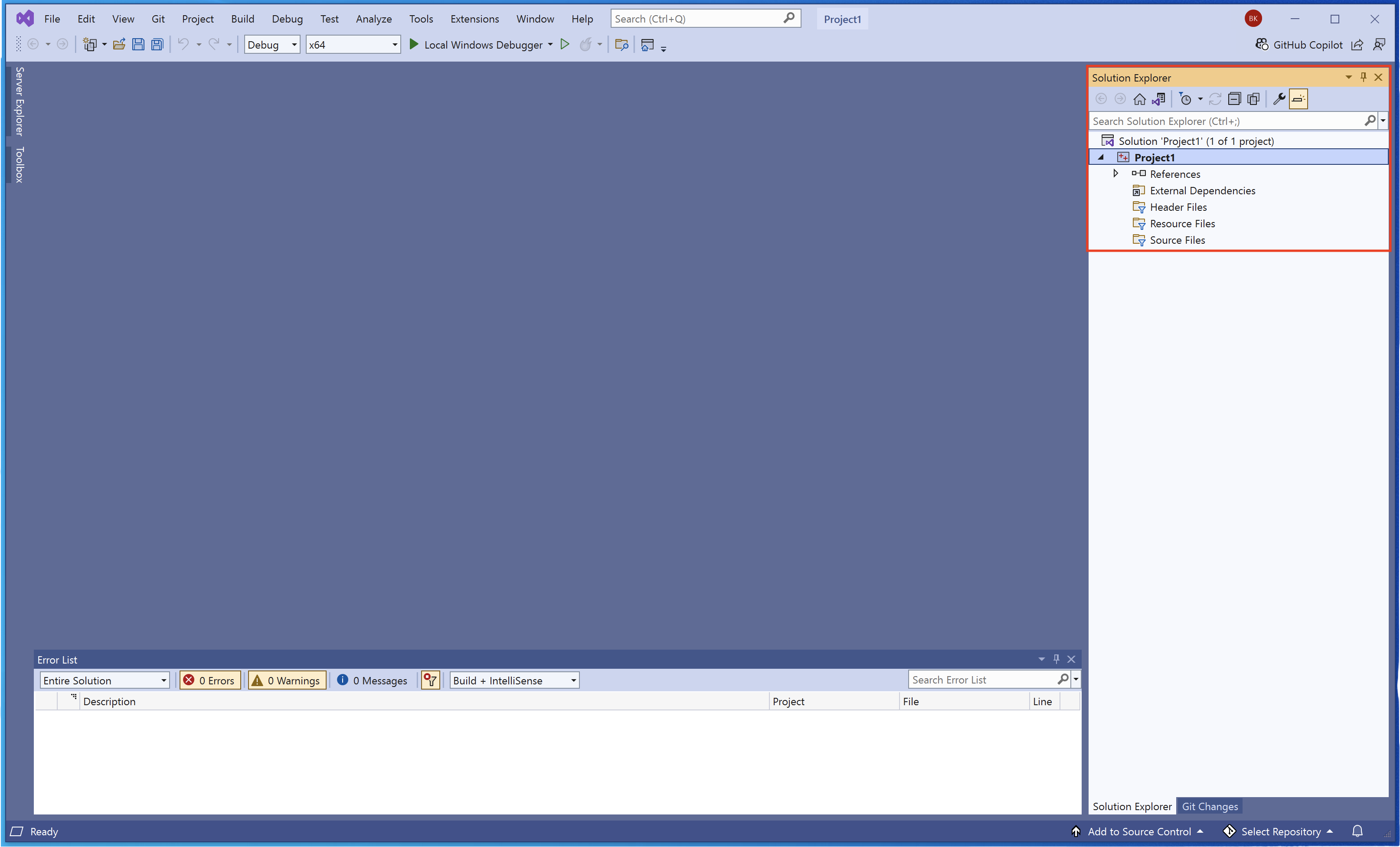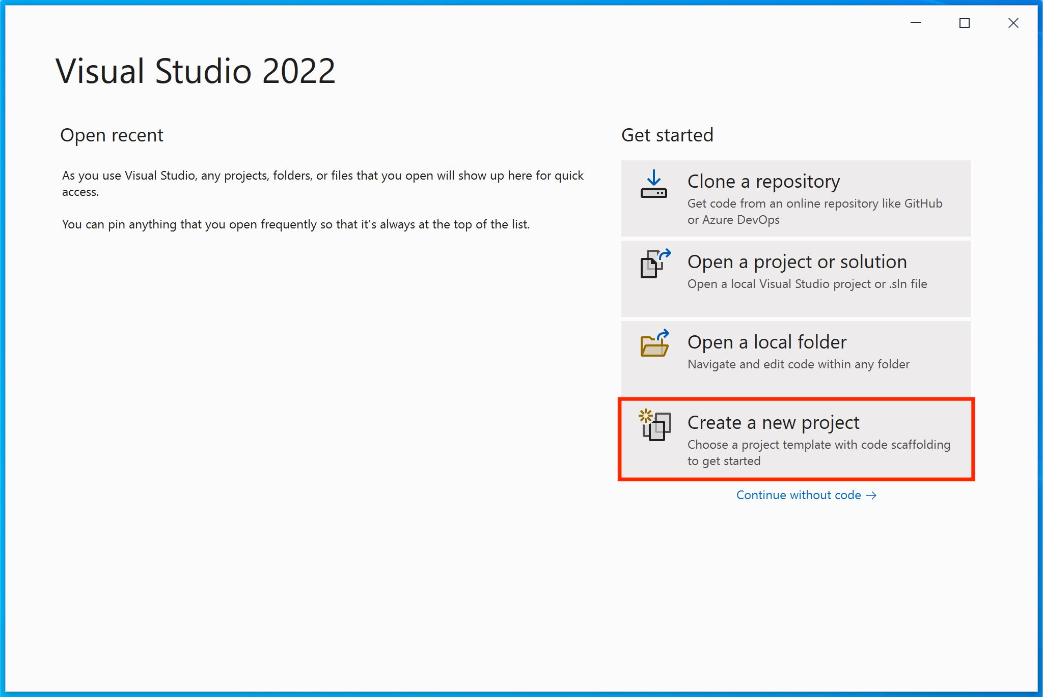 Because Visual Studio is a professional tool for writing large programs, there is a bit of setup required each time you want to work on a new program: a “project” must be created. The following steps for creating a project may seem overly complicated for the programs we will be writing in this class, but the process will become familiar with practice. (These instructions are for Visual Studio 2022. If you are using an earlier version, the process is similar but the interface may be slightly different — check with the instructor if you run into problems.)