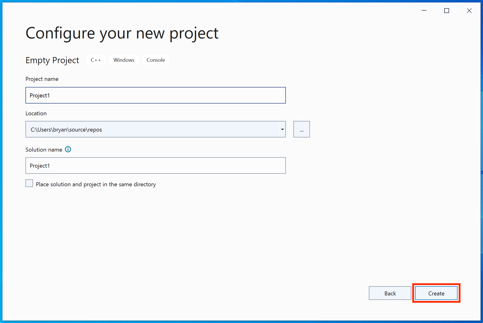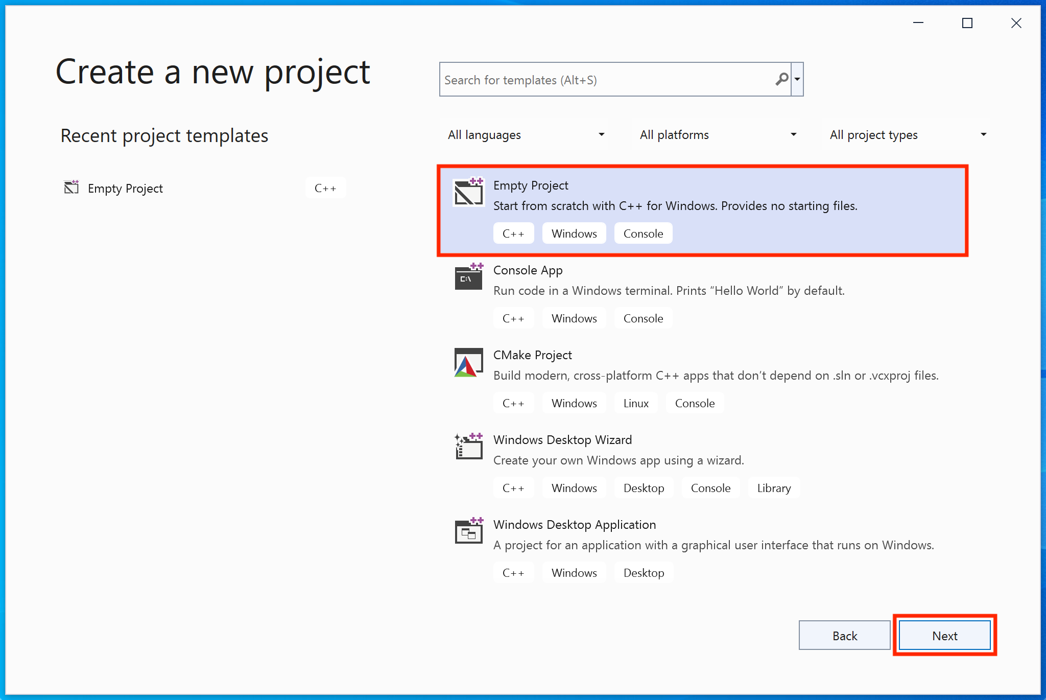 The “Create a new project” dialog box will appear. Choose the “Empty Project” template from the list and click “Next”. (The correct template option will have the description “Start from scratch with C++ for Windows. Provides no starting files.” If you do not see this template option, use the filters at the top of the dialog box to search for Language: “C++”, Platform: “Windows”, and Project type: “Console”.)
