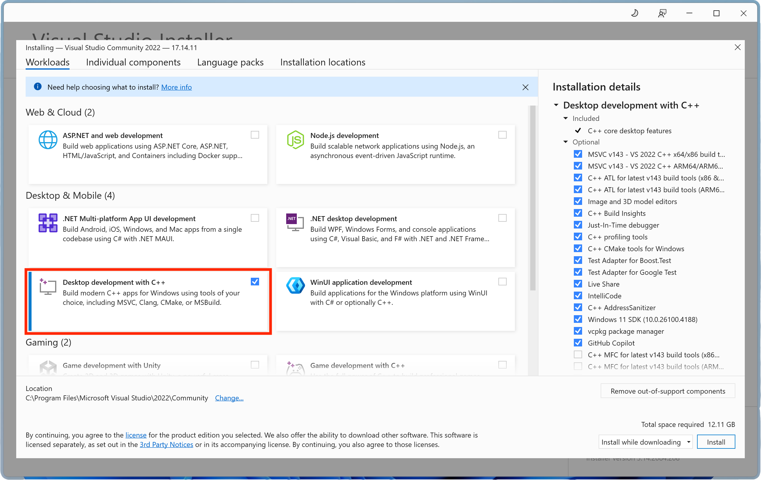 - During the installation process, you'll be asked to choose what kinds of projects you plan on creating. Be sure to select the item labeled “Desktop Development with C++”.