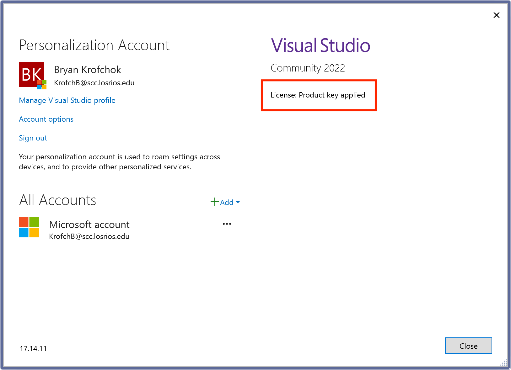 Once you've got Visual Studio installed, check that it's not running in trial mode. Go to the File menu, and select “Account Settings...”