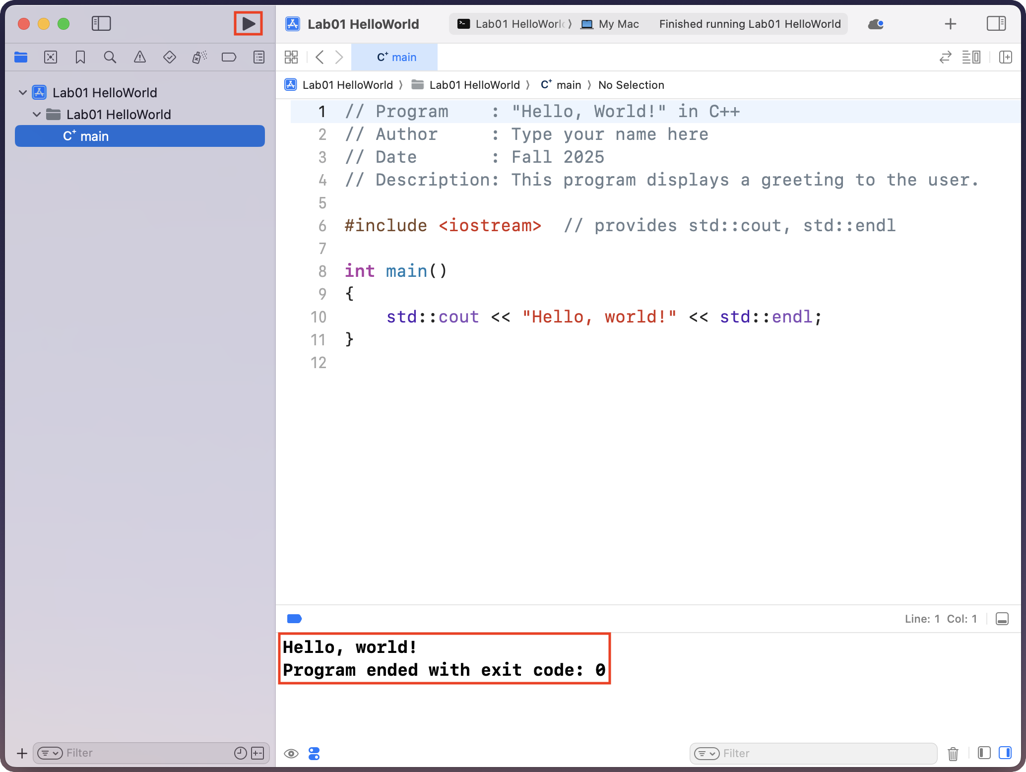 1// Program : "Hello, World!" in C++ 2// Author : Type your name here 3// Date : Fall 2025 4// Description: This program displays a greeting to the user. 5 6#include <iostream> // provides std::cout, std::endl 7 8int main() 9{ 10 std::cout << "Hello, world!" << std::endl; 11}When you have finished, press the triangular “Build and Run” (“Play”) button in the upper-left corner of the Xcode window to run your program.