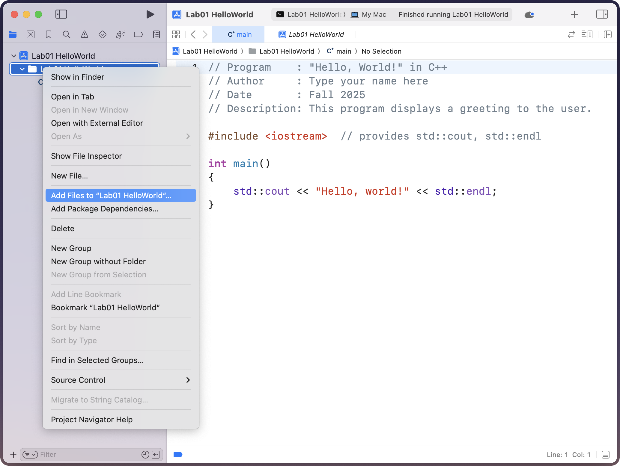 Rather than creating a new project for each and every program, some students prefer to use a single project and add and remove files as needed. This can be particularly helpful if you simply want to run a source code file that you've downloaded.
